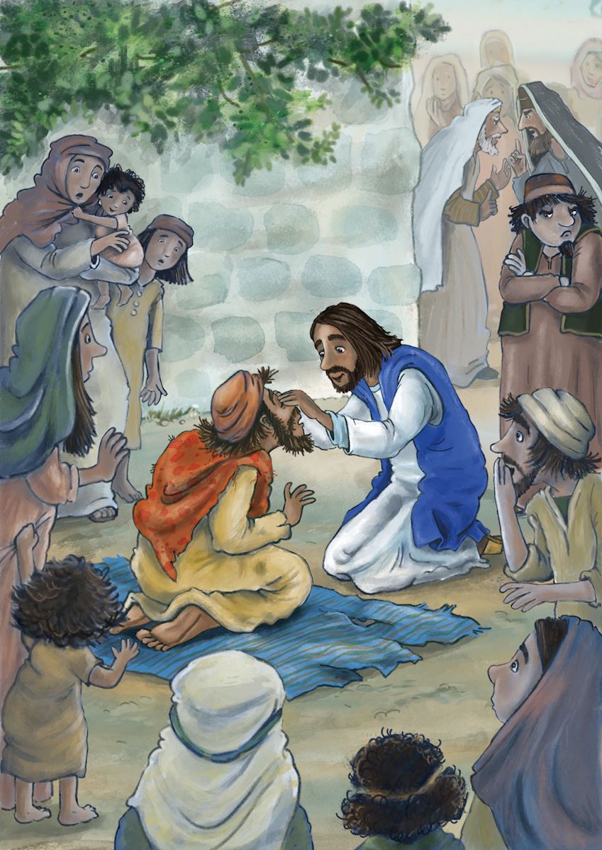 Jezus geneest iemand die al vanaf zijn geboorte blind is. De omstanders kunnen hun ogen niet geloven: is dat echt die man die blind was? Sommigen zeggen dat hij het niet kan zijn, maar dat hij er wel op lijkt. Een paar farizeeën zeggen dat Jezus niet van God kan komen, omdat Hij dit op sabbat gedaan heeft.