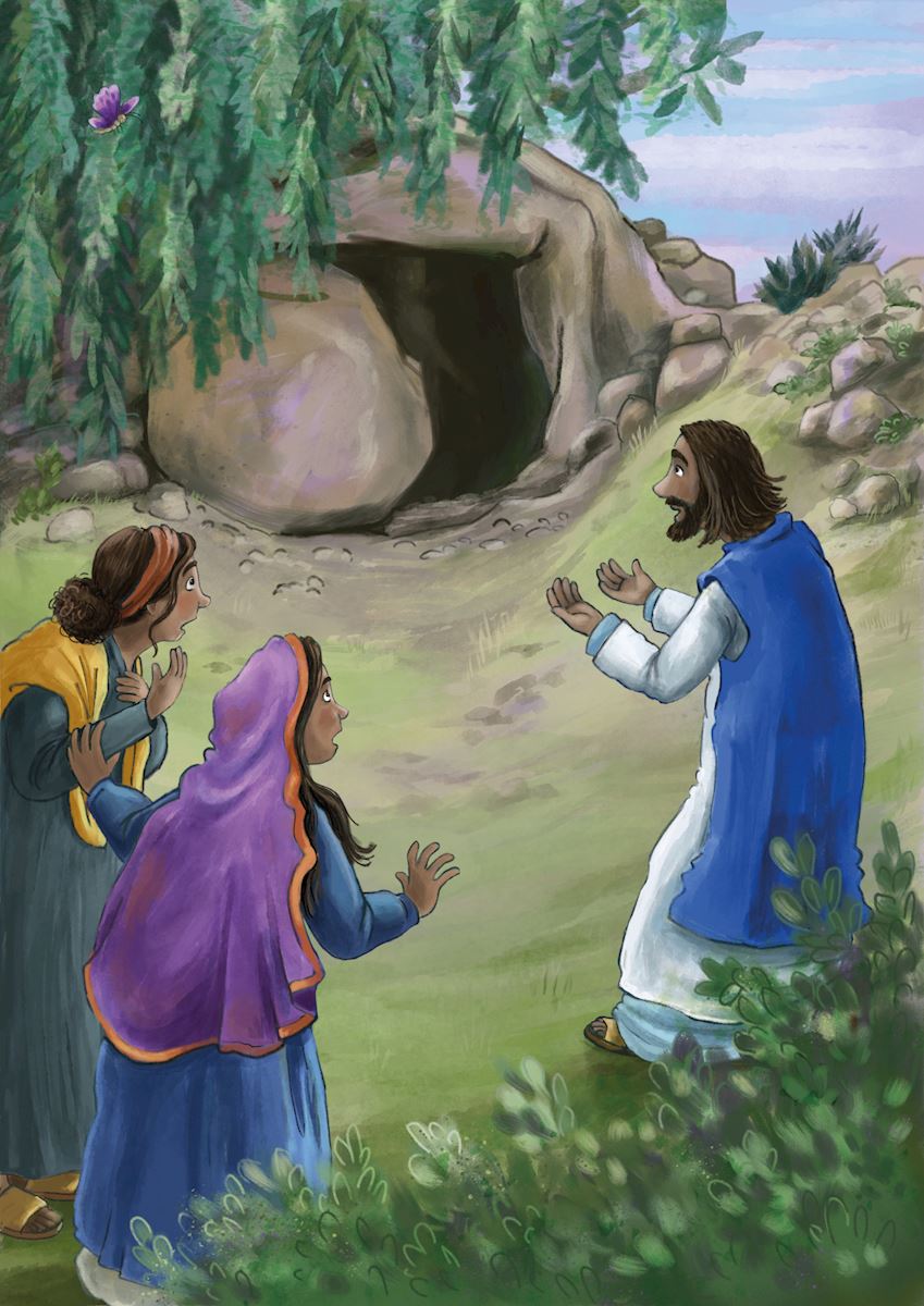 Lazarus is een vriend van Jezus. Als hij gestorven is, gaat Jezus naar hem toe. Er zijn veel mensen die verdrietig zijn omdat Lazarus niet meer leeft. Maar Jezus gaat naar het graf en roept: ‘Kom naar buiten!