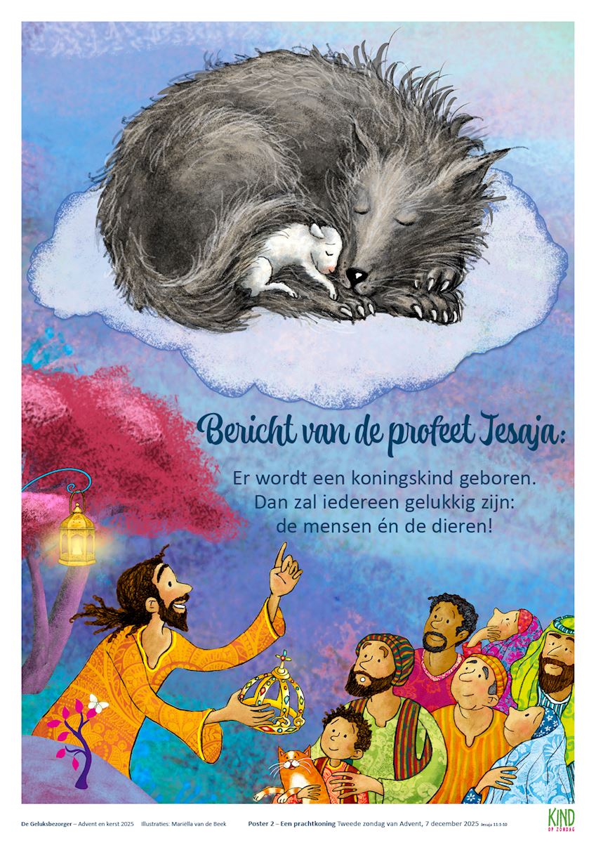 Tijdens de tweede Adventszondag kijken we naar een mooie plaat met Jesaja die een mooi verhaal verteld. Wanneer de koning komt, zal iedereen gelukkig zijn; mens en dier. Zo gelukkig zelfs, dat de wolf samen kan met een lammetje.