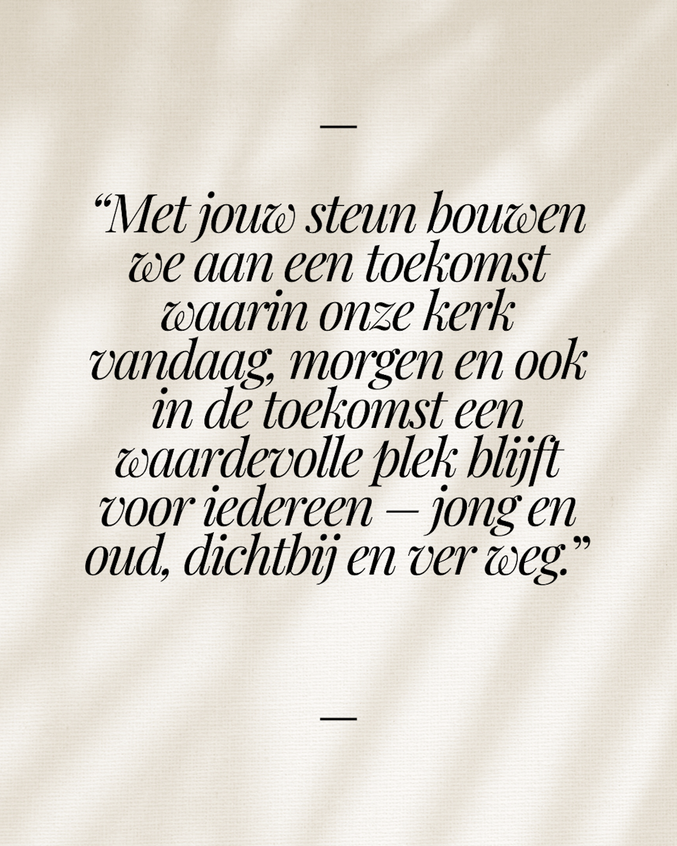 Onze kerk is een belangrijke plek voor mensen die in God geloven en het geloof met elkaar willen delen. Ook in de toekomst willen we dit vasthouden. Gastvrij en uitnodigend zijn voor jong en oud, voor gelovigen en voor hen die God nog niet kennen. Omkijken naar elkaar en naar mensen in de buurt die een steuntje in de rug kunnen gebruiken.