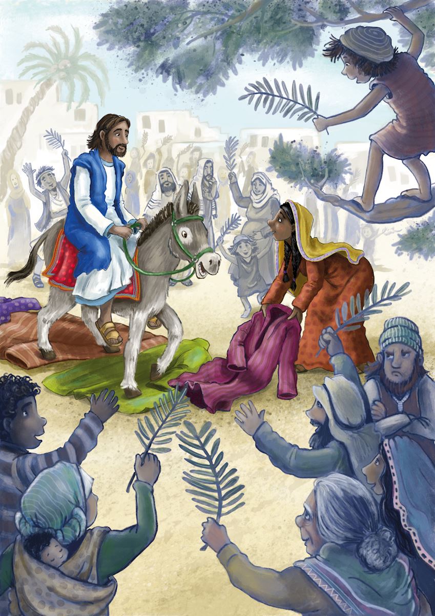 Elk jaar gaan mensen naar Jeruzalem om Pesach te vieren. Als Jezus in de buurt van de stad komt, vraagt Hij zijn leerlingen om een ezelin te halen. Daar gaat Jezus op zitten. Hij wordt als een koning binnengehaald in de stad
